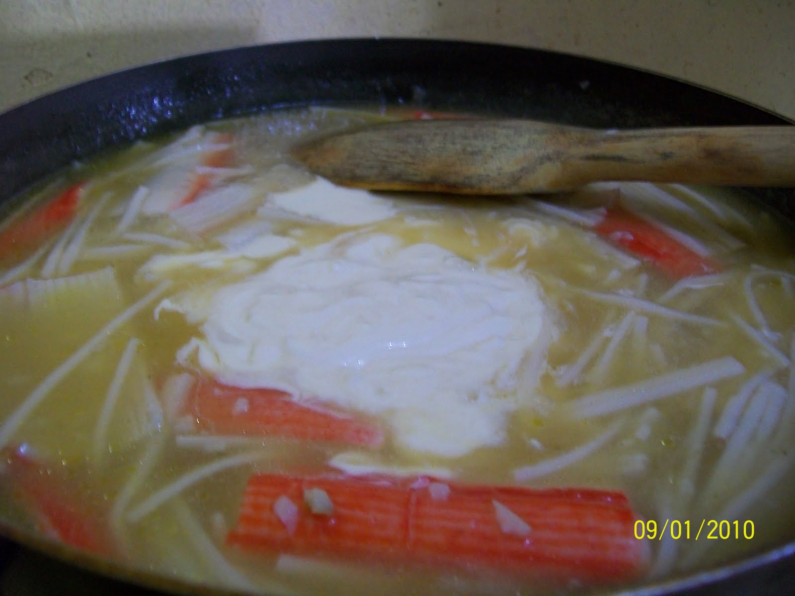 Add the crabsticks followed by a pack of all-purpose cream. Shopwise ran out of the soya-based cream so I had to make do with the dairy one.